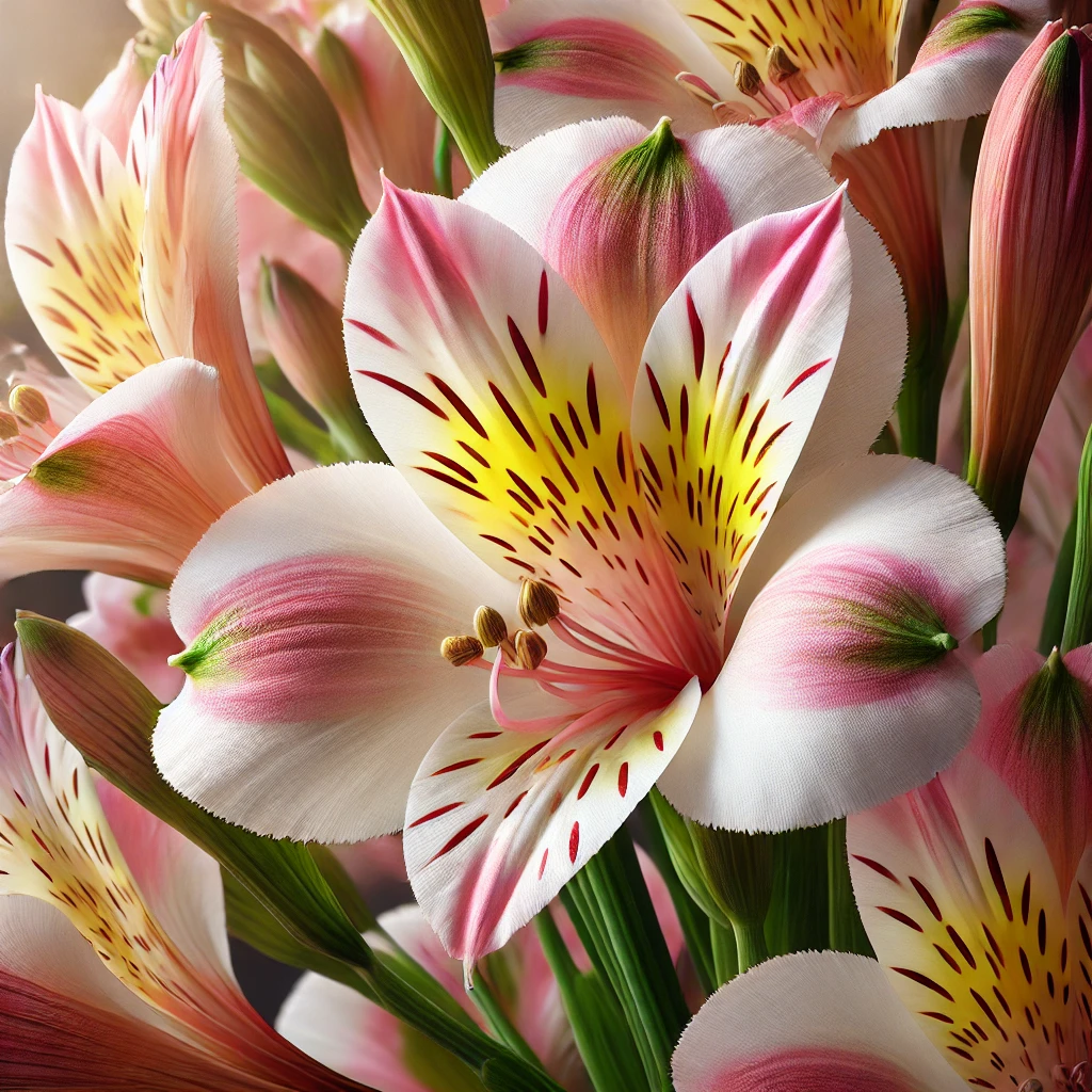 알스트로메리아 꽃잎에는 매력적인 점무늬와 줄무늬가 있어 클로즈업 촬영 시 독특한 질감과 패턴이 더욱 잘 드러납니다. 꽃잎의 디테일을 살리기 위해 매크로 렌즈를 사용하거나, 스마트폰의 접사 기능을 활용해도 좋습니다. 특히 사진 촬영 시 꽃잎의 섬세한 선과 패턴을 클로즈업으로 포착하면 꽃의 생동감이 살아납니다.