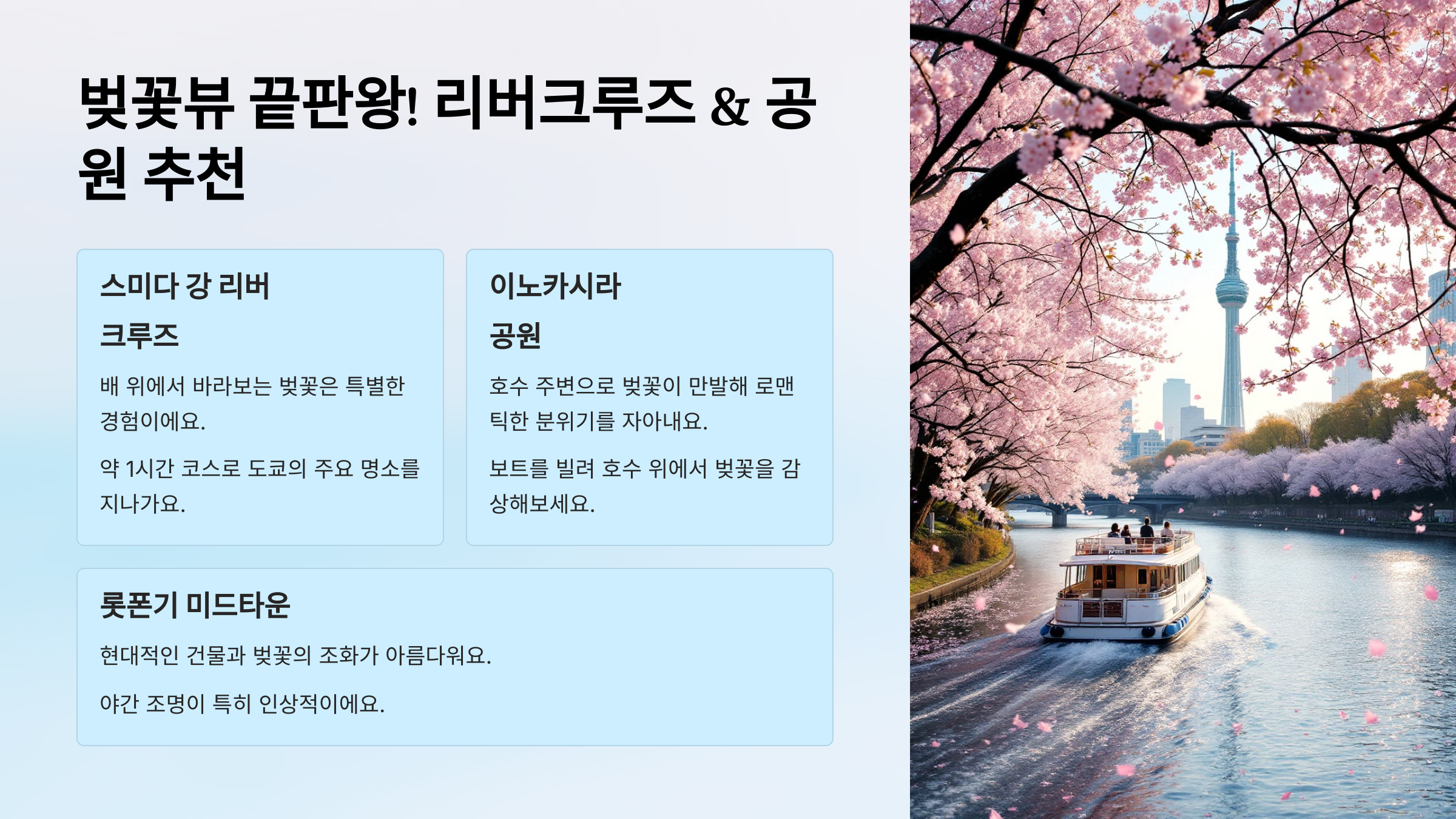 다음은 도쿄 벚꽃 뷰가 끝내주는 리버크루즈 & 공원을 추천해볼게요! 🚢🌸
