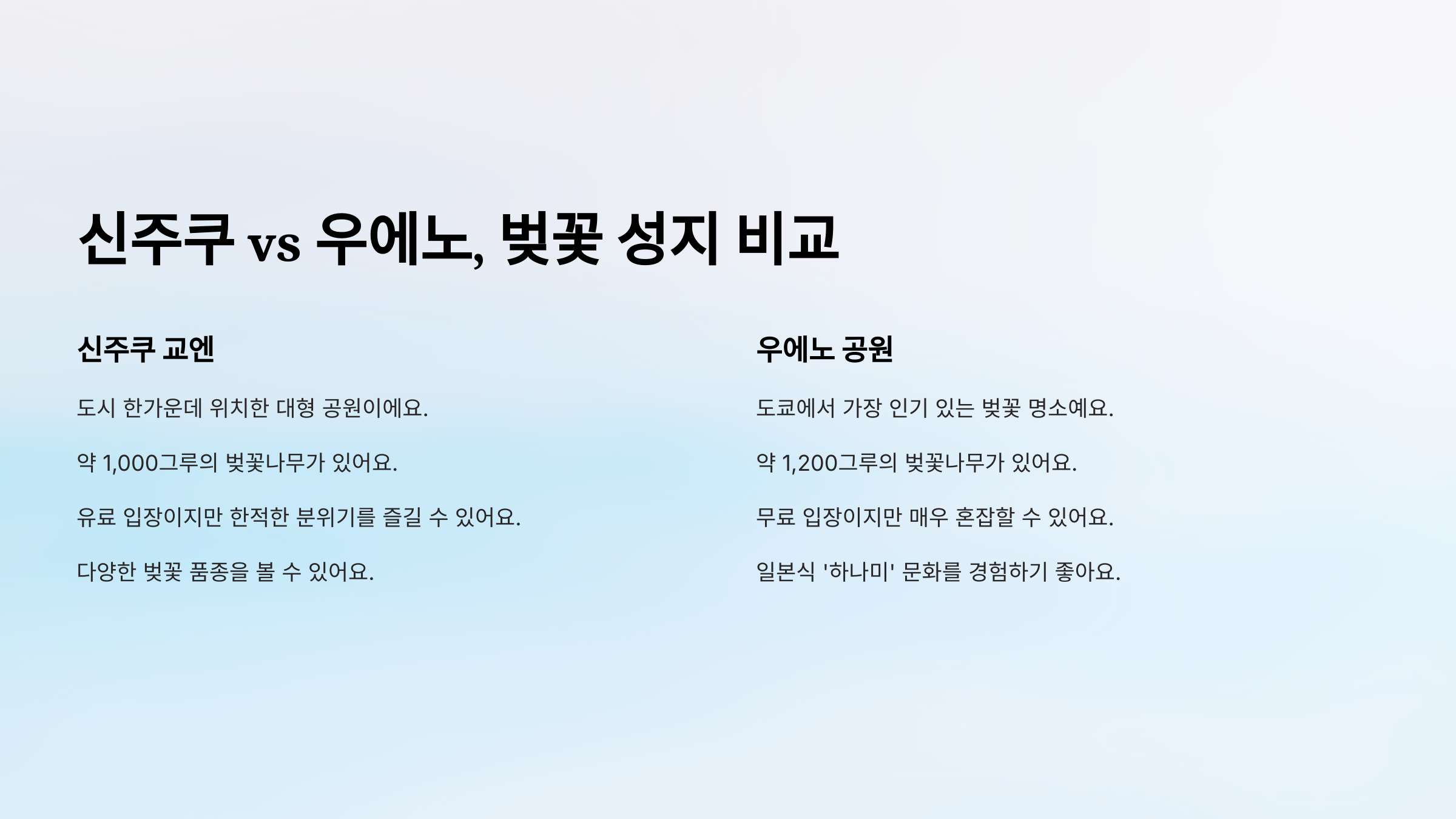 그럼, 다음은 도쿄의 대표 벚꽃 성지인 신주쿠 vs 우에노를 비교해볼까요? 🤔